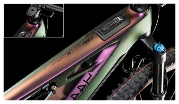 Un bon vélo est une question de détails, et le cadre du Cube Stereo Hybrid One44 HPC regorge de détails astucieux. Vous remarquerez le passage de câbles intégré, car il complète parfaitement les lignes épurées du triangle principal en carbone haute performance, tout en contribuant à réduire la maintenance. Le jeu de direction réglable vous permet d’adapter l’angle à vos besoins spécifiques. Un guide-chaîne Direct Mount maintient la chaîne bien en place, tandis que l’écran du tube supérieur Bosch, soigneusement intégré, vous montre en un coup d’œil des infos concernant le puissant moteur Bosch Performance Line CX et la batterie PowerTube de 800 Wh. Avec une fourche suspendue de 150 mm et un débattement arrière de 140 mm, il est prêt à affronter les sentiers les plus difficiles. La patte UDH signifie également qu’il est à l’épreuve du temps. Et, avec le système Size Split, vous avez une large gamme de tailles pour convenir à la plupart des pilotes.
